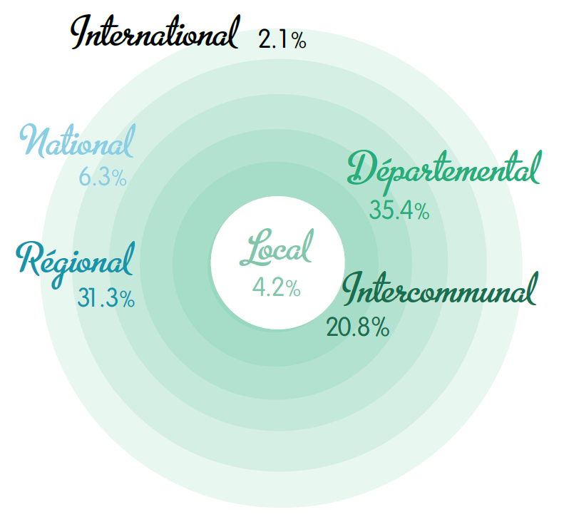 Les actions de proximité des structures d'éducation à l'environnement sont en cohérence avec le contexte régional. En effet, + de 60% des activités sont réalisées de l'échelle locale à départementale.